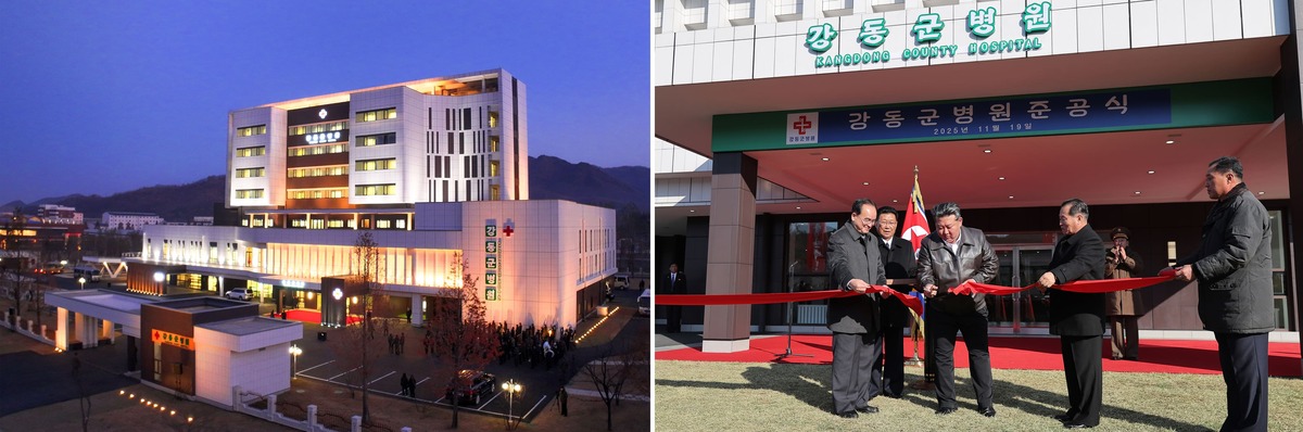 Уважаемый товарищ Ким Чен Ын разрезает красную ленту на церемонии ввода в строй Кандонской уездной больницы в рамках «политики развития периферии 20×10». Ноябрь 2025 г.
