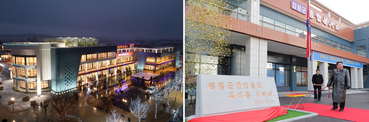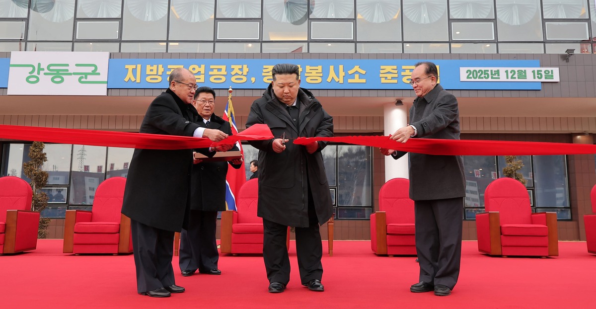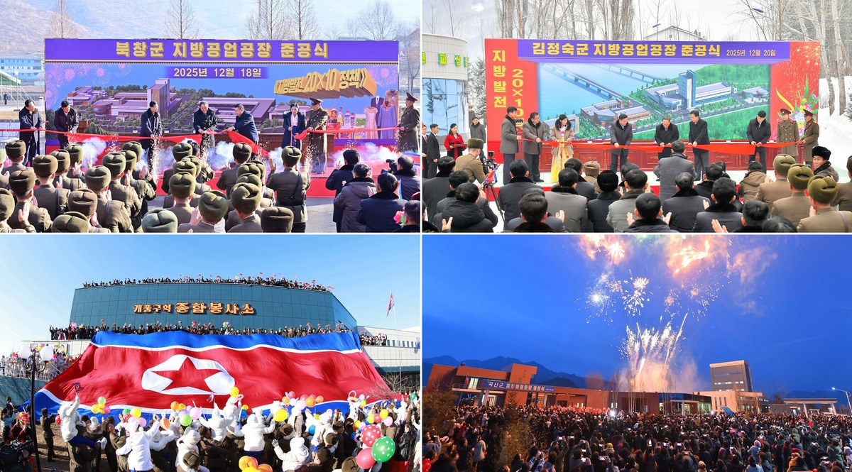 Уважаемый товарищ Ким Чен Ын на церемонии ввода в строй предприятий местной промышленности и комплекса культурно-бытовых услуг в уезде Кандон в рамках«политики развития периферии 20×10». Декабрь 2025 г.