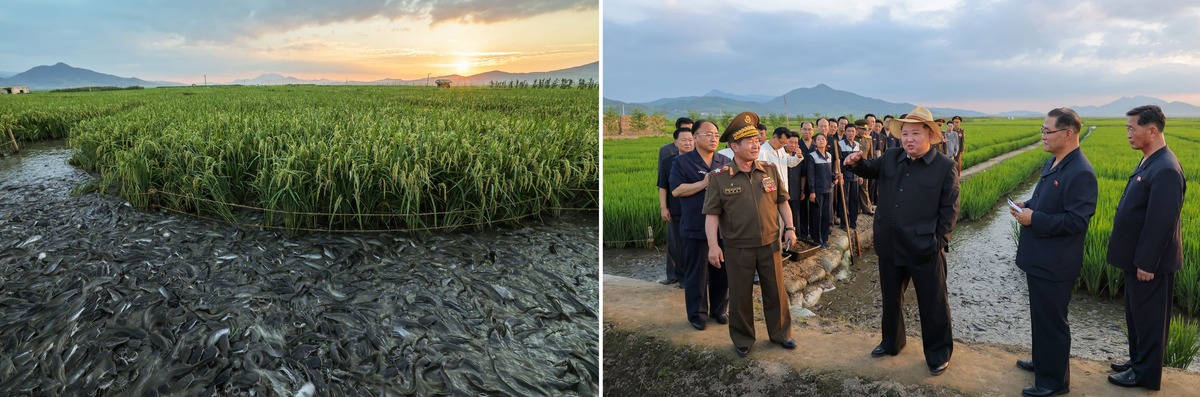 Уважаемый товарищ Ким Чен Ын ознакомляется с ведением сомоводства на заливных рисовых полях. Июль 2025 г.