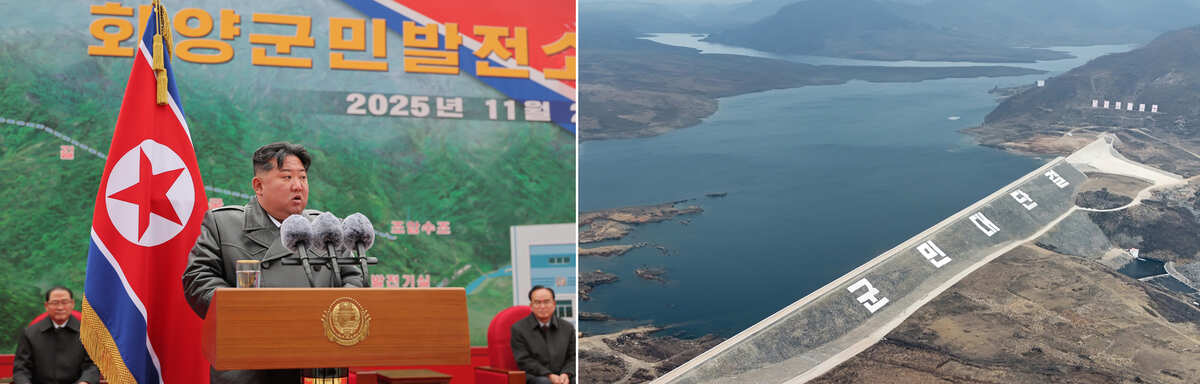 Уважаемый товарищ Ким Чен Ын выступает со знаменательной речью на церемонии ввода в строй Хвэянской ГЭС «Армия и народ». Ноябрь 2025 г.