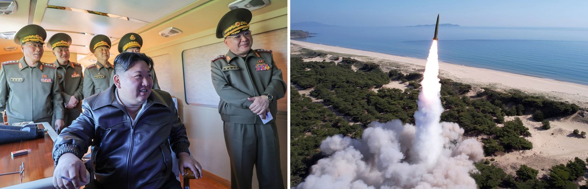 Уважаемый товарищ Ким Чен Ын смотрит испытательный запуск для проверки комплексных боевых характеристик новейшей зенитно-ракетной системы. Март 2025 г.