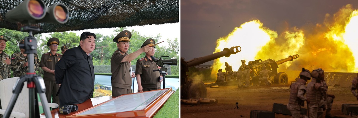 Уважаемый товарищ Ким Чен Ын руководит совместными учениями по нанесению удара дальнобойным орудием и ракетными системами подразделений КНА на восточном участке фронта. Май 2025 г.