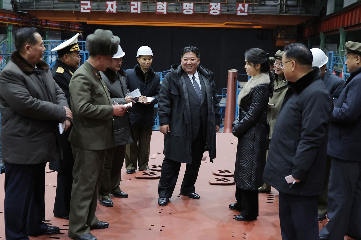 Уважаемый товарищ Ким Чен Ын руководит на месте строительством атомной подводной лодки со стратегическими управляемыми ракетами. Декабрь 2025 г.