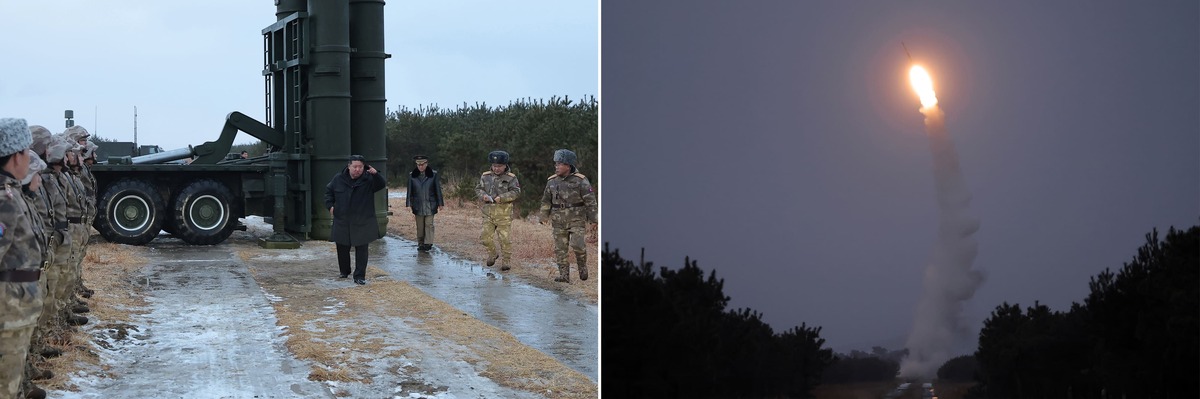 Уважаемый товарищ Ким Чен Ын наблюдает испытательный запуск новейших противовоздушных ракет. Декабрь 2025 г.