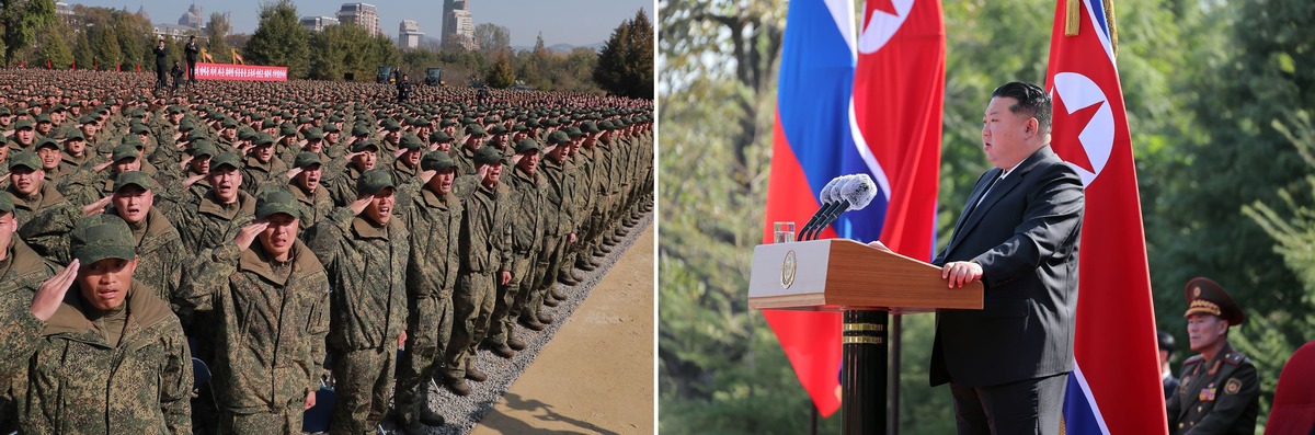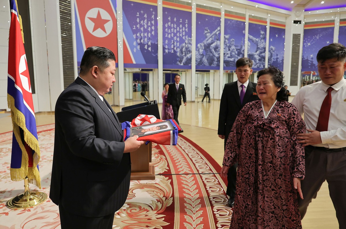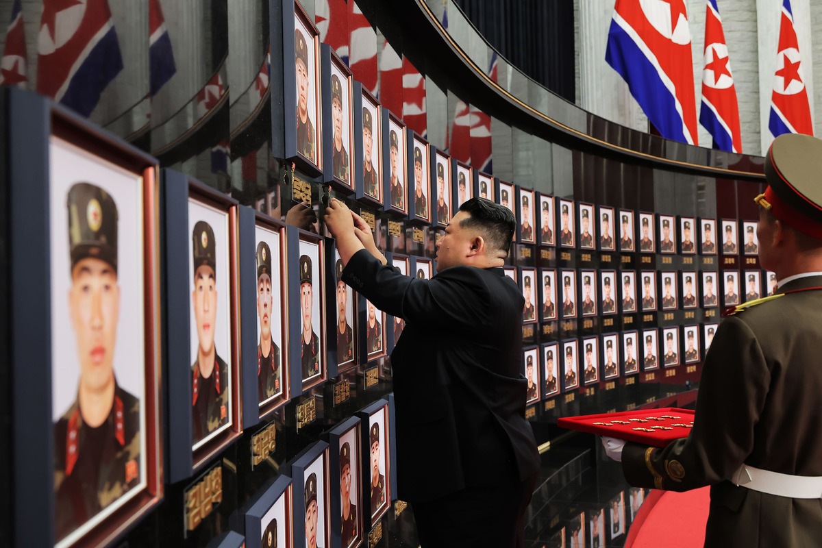 Уважаемый товарищ Ким Чен Ын на церемонии вручения государственных наград командирам и бойцам войск зарубежной операции КНА прикрепляет медали Героя КНДР к портретам павших воинов. Август 2025 г.