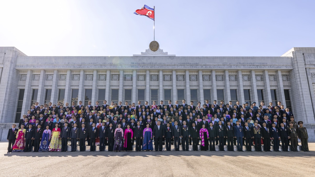 Уважаемый товарищ Ким Чен Ын фотографируется на память с передовиками труда и заслуженными работниками, приглашенными на торжества в честь 77-летия Республики. Сентябрь 2025 г.