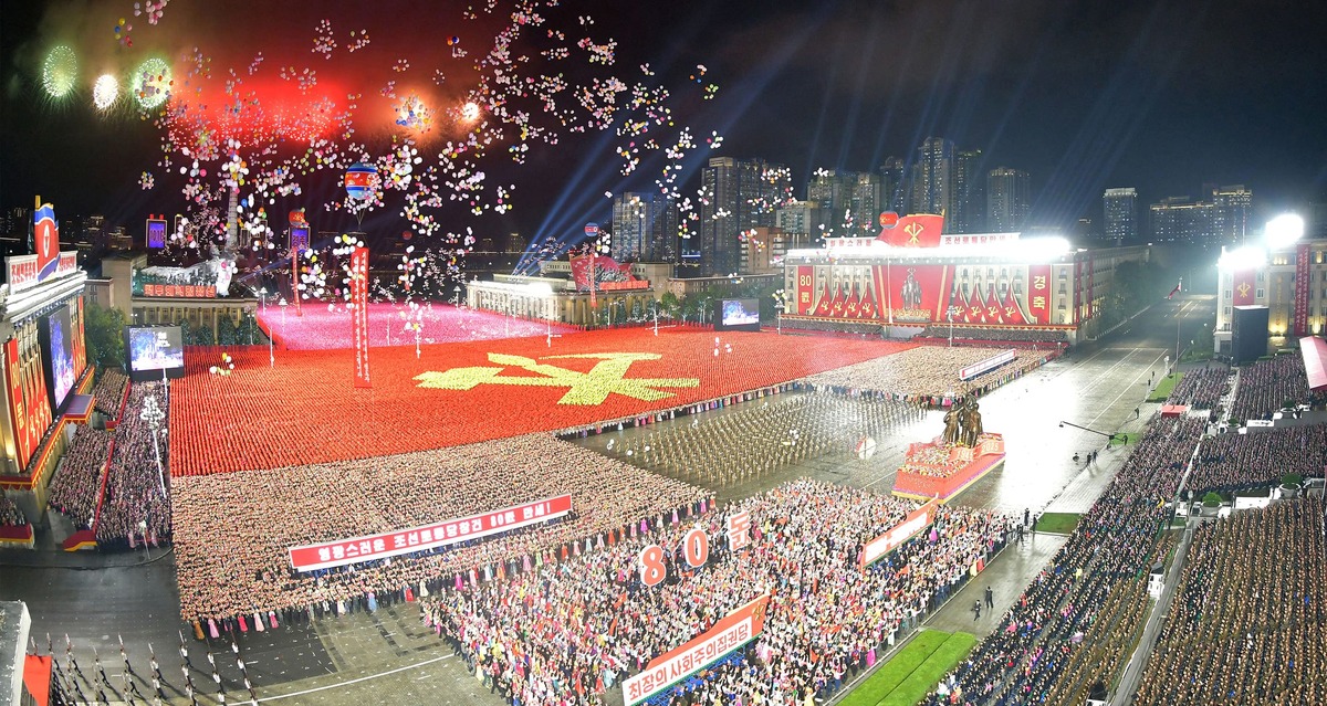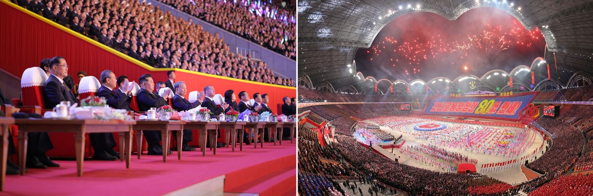 Уважаемый товарищ Ким Чен Ын вместе с главами партий и правительства разных стран смотрит массовые гимнастические и художественные выступления в честь 80- летия ТПК «Да здравствует ТПК!» Октябрь 2025 г.
