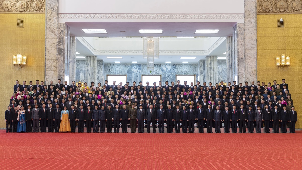 Уважаемый товарищ Ким Чен Ын с передовиками труда и заслуженными работниками, приглашенными на торжества в честь Дня Конституции КНДР и новогодние праздничные мероприятия. Декабрь 2025 г.
