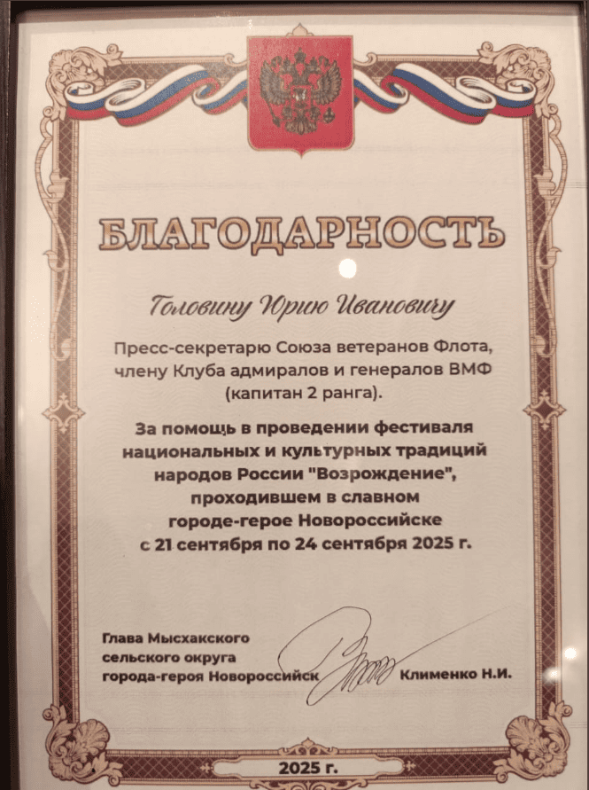 - Ю.И. Головину — уроженцу города Кореновска, военному журналисту – пресс-секретарю Союза ветеранов ВМФ и Клуба адмиралов и генералов ВМФ, модератору телеграм-канала «ВАХТЕННЫЙ ЖУРНАЛ», капитану 2 ранга;