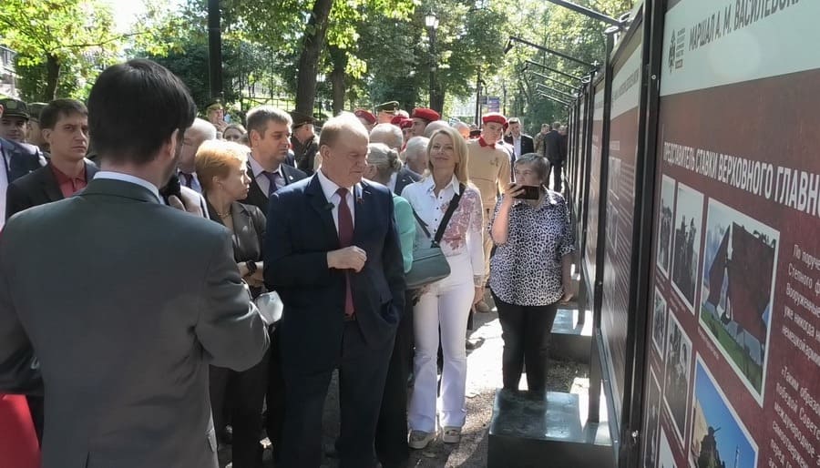 «Дорогие друзья, уважаемые гости, дорогие товарищи! Александр Михайлович нашел прекрасные слова, обращаясь к выпускникам Академии генерального штаба „Много на земле прекрасных уголков. Но как одна у человека мать, так одна у человека родина! В жизни каждого человека наступает момент, когда он должен встать на защиту своего Отечества“. Так и было в жизни маршала Василевского. Он возглавлял ключевые операции в годы Великой Отечественной войны. В 1956 году решением двух маршалов – Жукова и Василевского – был создан Советский комитет ветеранов войны. Именно здесь, в этом доме, решались важнейшие задачи, включая создание Могилы неизвестного солдата у Кремлевской стены и Музея Победы на Поклонной горе. Очень приятно видеть сегодня юных карбышевцев, ребят из нашей подшефной школы Маресьева, участников движения поисковиков. Мы награждаем здесь лучших из них, и я уверен, что лучшие получат высокие награды в нашем Зале славы. А вы, ребята, получите первую в своей жизни памятную медаль о посещении этой выставки».